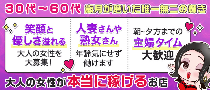30代・40代・50代の大人の女性が本当に稼げるお店となりますので、本気で稼ぎたい貴女を全力サポートしております!